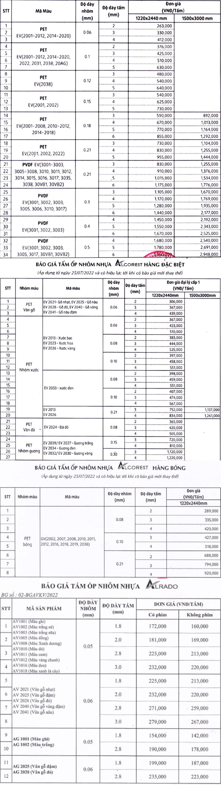 Bảng giá tấm nhôm Alu Alcorest tháng 5/2023