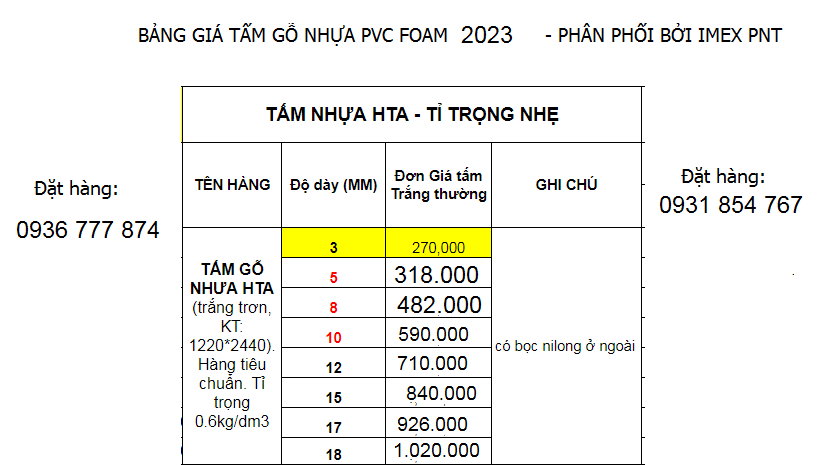 Bảng báo giá tấm nhựa pvc foam và tấm formex cập nhật tháng 2/2023. Tấm nhựa pima sử dụng làm vách ngăn , trang trí văn phòng, nhà tắm, nhà bếp. công ty IMMEX PNT chuyên phân phối tấm pvc foam tại tp hcm. bình dương ,đồng nai. Ngoài ra tấm pvc foam board pima còn hay được gọi là tấm pima gỗ nhựa hay tấm ván nhựa.