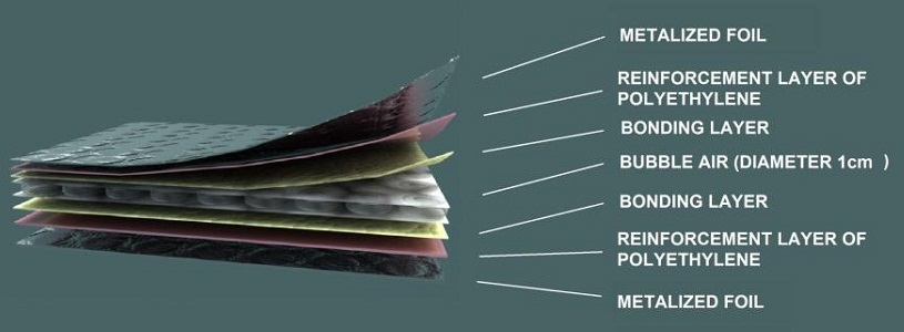 Tấm cách nhiệt A2 CÁT TƯỜNG được cấu tạo bởi một lớp nhựa PE gồm nhiều túi khí tròn ø=10mm, hai mặt phủ màng nhôm dày nguyên chất. Lớp màng nhôm màu sáng bạc giúp phản xạ nhiệt bức xạ. Lớp nhựa túi khí giúp tản nhiệt nhanh và ngăn sóng âm thanh truyền qua.